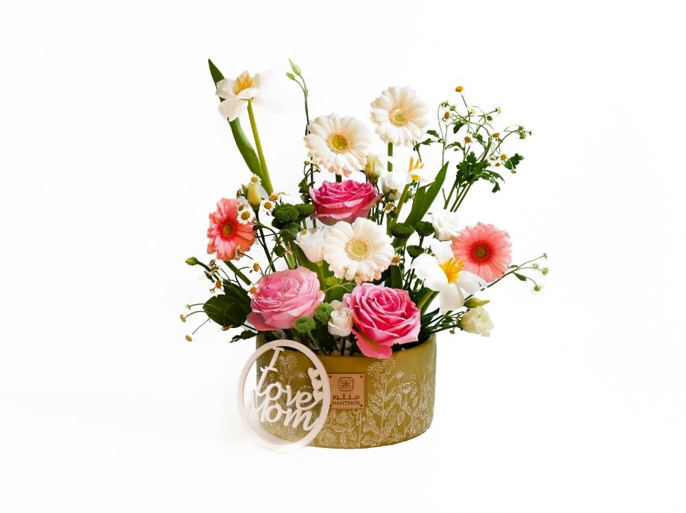 تصميم خلاّب من الورد الطبيعي تم وضعه في فازة ليعطي منظر فاخر ومبهج و يلفت الأنظار مع تغريسة تعبر عن حب الأم